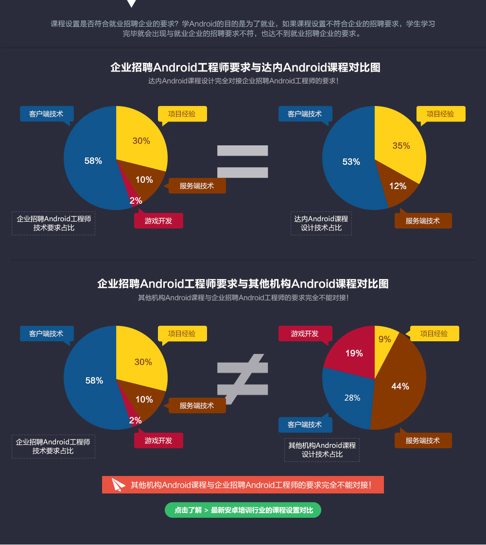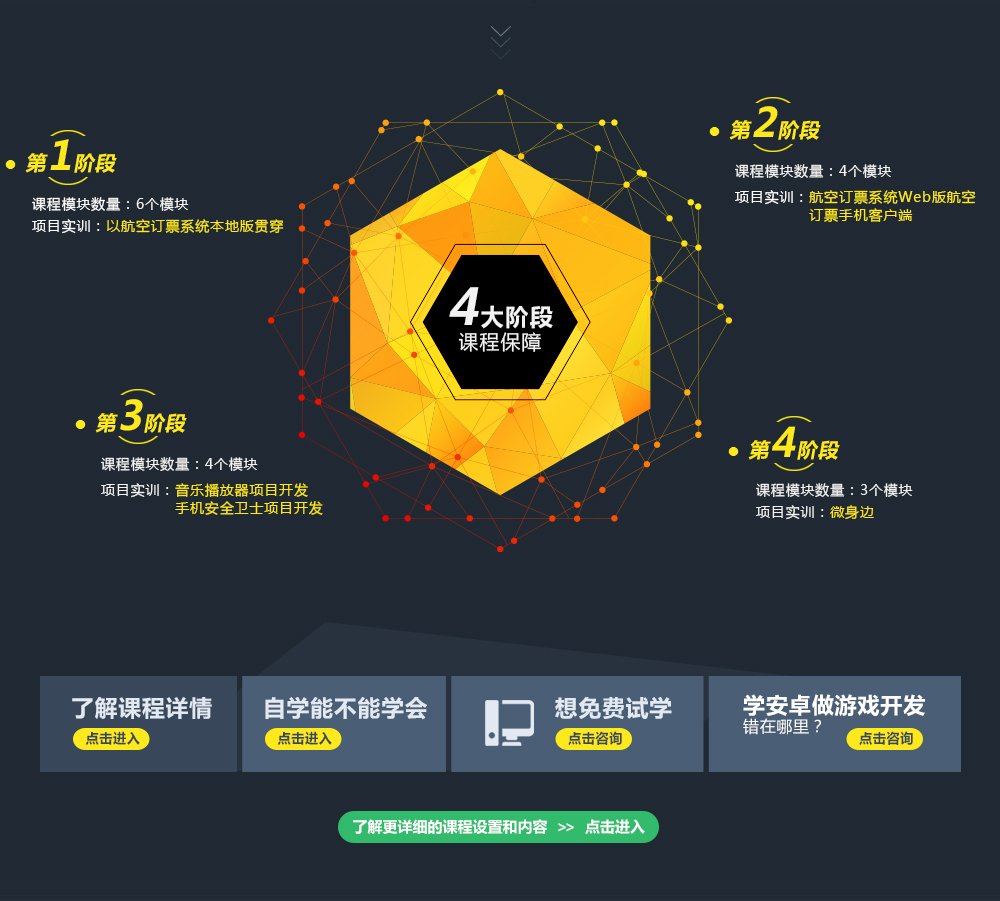 达内Android课程体系以招聘企业的需求为核心进行的课程体系设置,整个课程分为