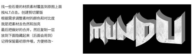3、找一些石膏的材质素材覆盖到原图上面,按ALt点击创建剪切蒙版。根据需求调整 素材的颜色和对比度。我是把素材去色然后加亮。最后把做好的合并,然后复制一层 放到下面隐藏起来。