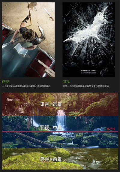 四、怎样找透视合理的素材: 咱们这次讲找素材最简单的看透视方法,一个画面一般有三种视角:俯视、仰视、平视, 其中平视用到的最多,平视就是目光直射前方没有抬头看也没有低头看。把自己想象成 摄影师在画面中你的目光直射前方看到的那个点。