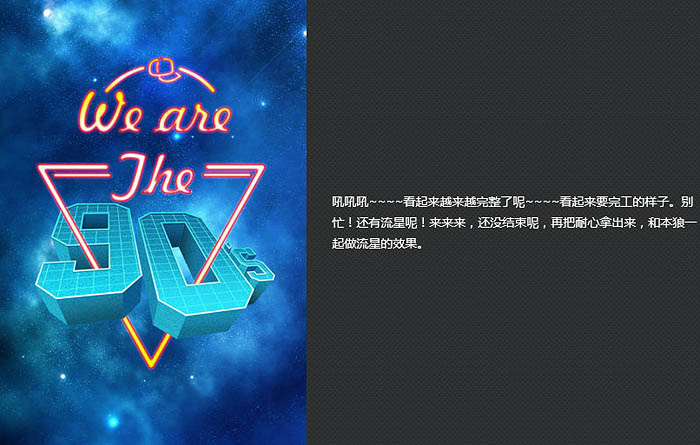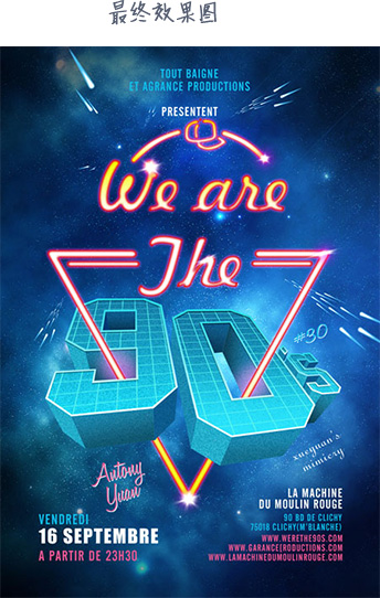 效果图由背景、文字、装饰三部分构成,文字部分制作比较重要,包括立体字 及霓虹字。立体字制作稍微复杂一点,需要纯手工制作。