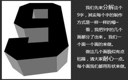 3、我们先来分解这个“9”字,其实每个字的制作方式都是一样的。文字的几个面 都分了出来,我们一个面一个面的来制作。