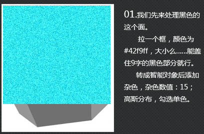 4、先处理黑色这个面,拉一个框,填充颜色:#42f9ff,大小能盖住文字就行, 转为智能对象后添加杂色,设置:15/高斯分布/勾选单色。