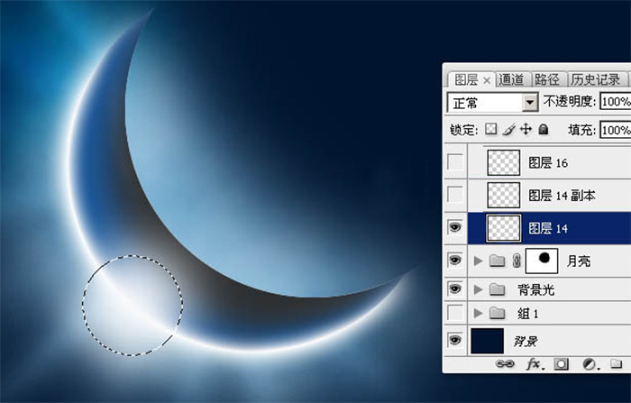 29、在组里新建一个图层,用椭圆选框工具拉出下图所示的选区,羽化15个像素后填充白色。