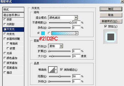 32、给图层添加图层样式,选择外发光,参数及效果如下图。