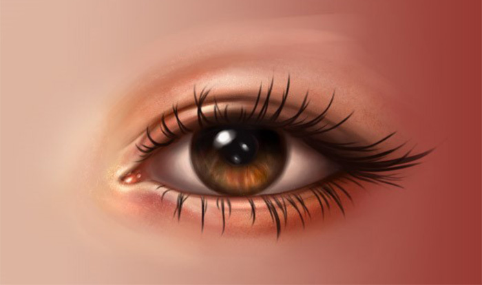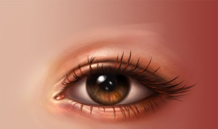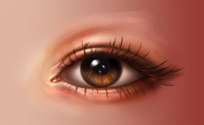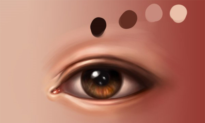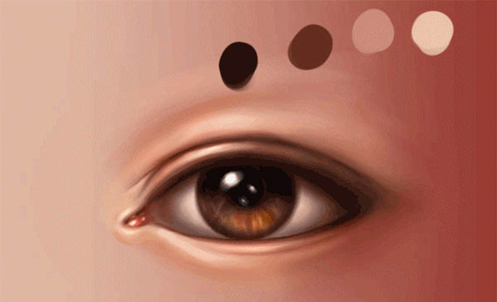 用#d18465在眼睛下部描画,就好像我们在生活中使用遮瑕膏化妆一样。如果你认为有必要,也可以在眼睛上部也这么做。然后使用#eac0a9,在眼睛左下部和泪腺处描画,然后添加一点高光。对比下面两幅图,就能发现这一步前后的效果。