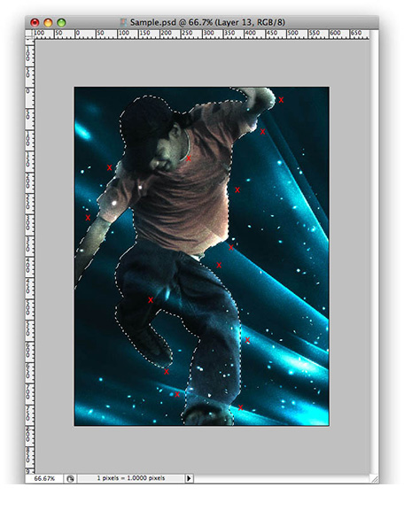 19、按住Ctrl键的同时单击在图层的缩略图创建一个选区的人。然后创建一个新层内的“灯”文件夹。现在选择画笔工具(B),用大刷,125px直径和硬度,0%。使用50%的透明度。之后,开始画画的人的一些部分突出他们。
