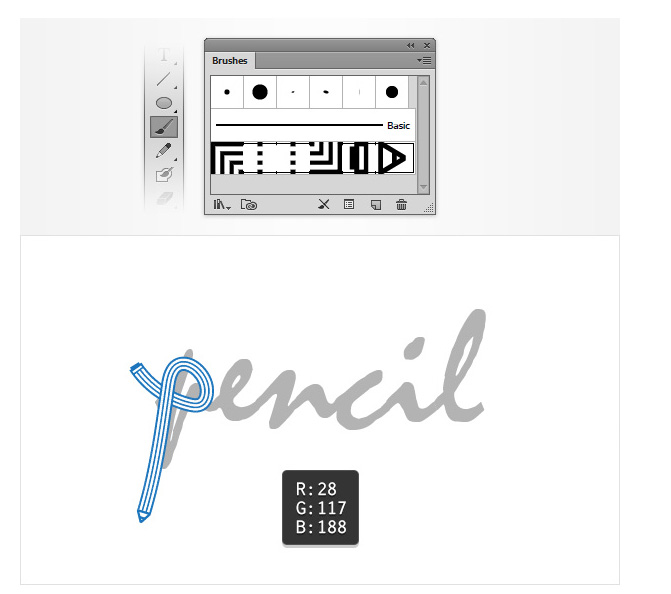 选择画笔工具(B),选择“Pencil Brush“笔刷画出第一个字母。 选中这个路径,打开外观面板,将描边的颜色改为 R=28 G=117 B=188.