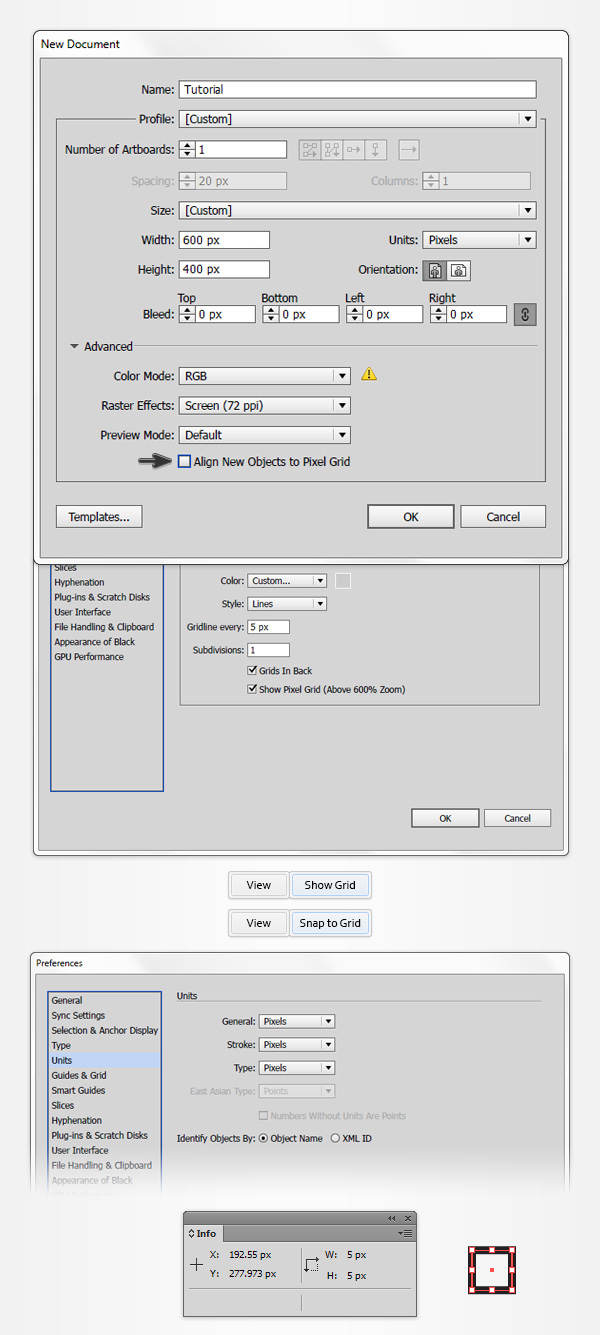 Ctrl-N创建一个新的文档, 从单位下拉菜单中选择像素,宽度和高度为600×400。然后点击高级按钮。 选择颜色模式为 RGB,屏幕(72ppi)去掉勾选“使新建对象与像素网格对齐”。