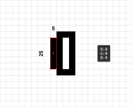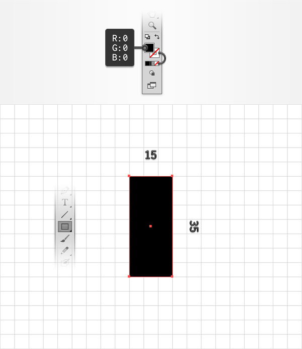 选择矩形工具(M), 将描边设置为“无”,选择填充并设置其颜色为黑色(R = 0 G = 0,B = 0)。画一个大小为15×35像素的矩形。