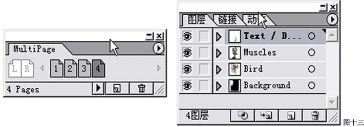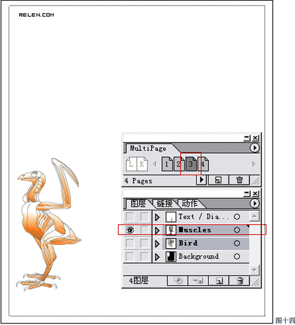 略过如何安装此插件(可查看Relen其他工作日记)。重新启动Illustrator,选择菜单:窗口> Show MultiPage 可以打开MultiPage面版。置入一副拥有四个图层的作品后,我们可以看到,MultiPage面版中的页数与图层树相等。(图十三)