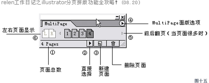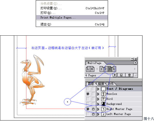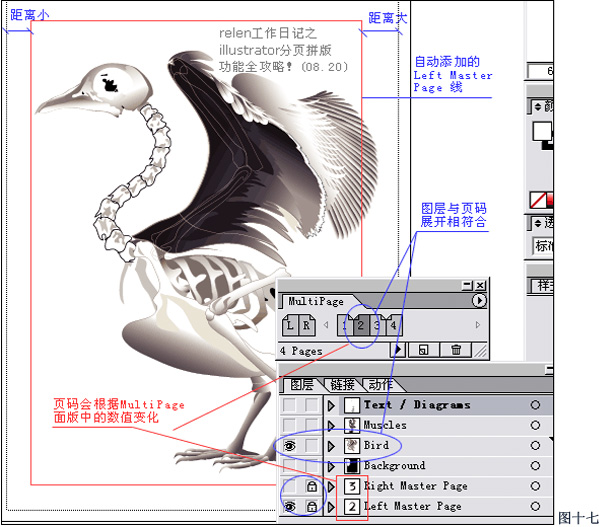 如图十七所示,当我们选择MultiPage面版中的第二页时,它属于左页面,图层面版则显示两个图层,一是:第二页面所指向的图层,其中的内容是鸟的骨架。二是Left Muster Page控制层,显示它,则出现页面上的红色线框,同时,出现页码数。页面数是跟着MultiPage面版中的数值变化的。如果我们不想使用这个功能,可以在图十六中的Master(页面控制)选择里关掉Use page Number。