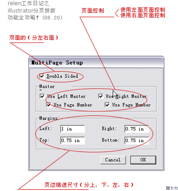 如图十六设置完毕后,图层面版中多出三个图层: Left Master page 、Right Master Page,分别是左边控制(加琐层),右边控制(加琐层)。同时,MultiPage面版中 ⑥ 区域被激活。(图十七)