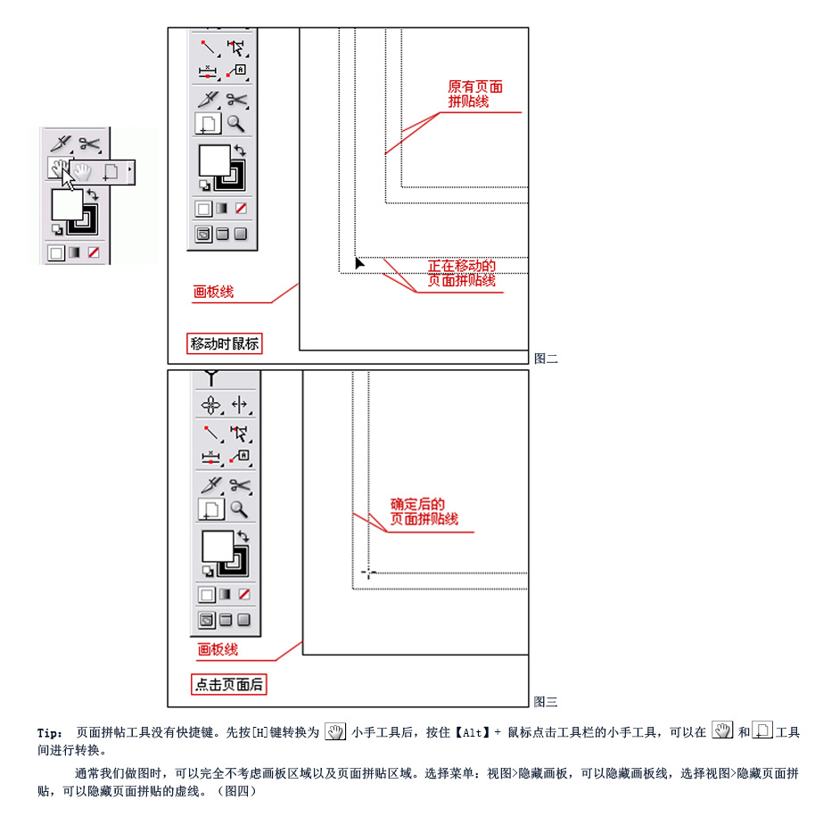 Adobe Illustrator从早期版本就已经设置了 页面工具(page tool),当我们选择它在页面上挪动时会产生如图二、图三的情况。
