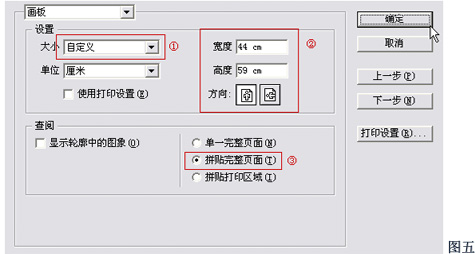 ② 填写“四开”尺寸44cm×59cm;同时定义方向为竖向。