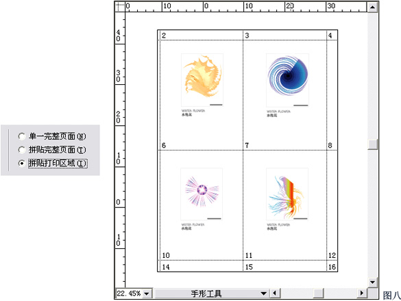 此时,打开文挡设置面版【Ctrl+Alt+ P】,把拼贴选项改为拼贴打印区域。则产生如图八的情况。此时我们可以看到,留白区域也被划分,且标上了页码。
