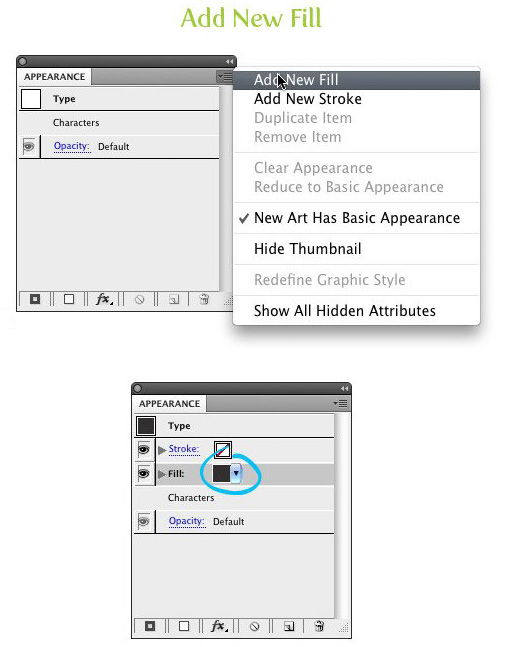 用直接选择工具选中文本,打开外观面板中的外观面板菜单(左上方的按钮),然后选择新建填充色。