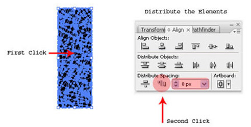 现在让我们把这些小块形状散布一下。全选,然后再接近矩形中间的位置单击,然后再对齐面板中点击 “水平散布” 的小图标,设置间距值为 0px。 结果是这些小形状会间隙很大的分布在你的画板中。