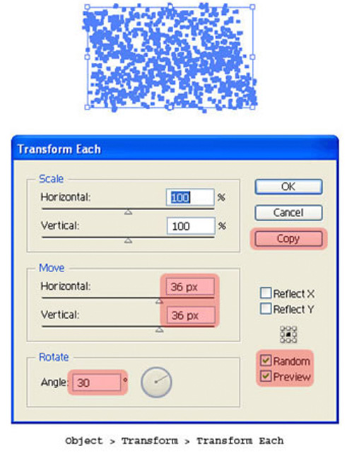 现在,基本的我们的喷溅元素已经准备好了。选择全部的小形状,单击 对象 > 变形 > 单独变形 (Alt + Shift + Command + D)。输入横向/纵向值为30px. 再循环中输入30度,选择随机。然后点击复制。