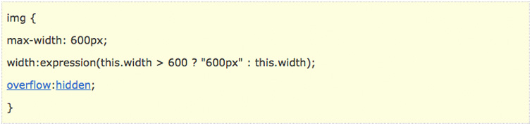 其中 max-width:600px; 在IE7、FireFox等其他非IE浏览器下最大宽度为600px,但在IE6中无效;width:600px; 在所有浏览器中图片的大小为600px,当图片大小大于600px,自动缩小为600px,在IE6中有效;而 overflow:hidden; 指将超出设置大小的部分隐藏,避免控制图片大小失败而引起的表格撑开变形。