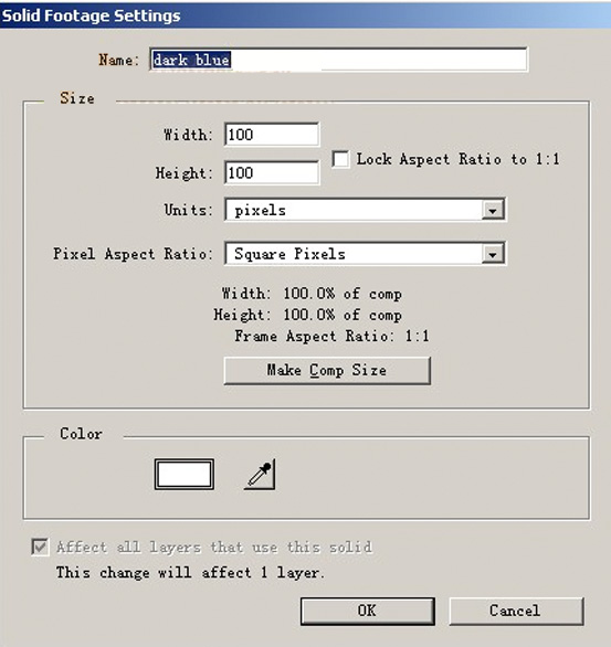 1、新建固态层dark blue:Layer->New solid,命名为dark blue,颜色为白色,注意点击“Make Comp Size”,点“OK”退出。层的大小设置如图3所示。