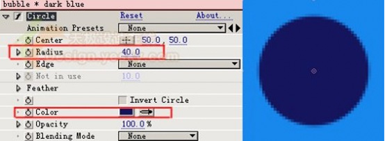 2、给dark blue层引用Effect->Render->Circle,用于产生圆形的粒子泡泡,在如图4所示的设置界面中设置粒子的半径(Radius)为40,设置颜色(COLOR)为黑蓝色(#14155D),效果如下。