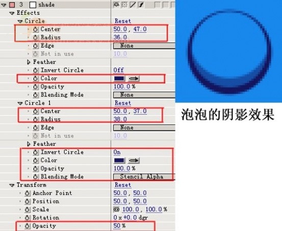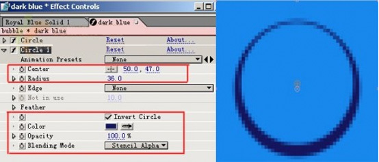 3、给dark blue层再次引用Effect->Render->Circle,这时该Circle特效自动命名为Circle1, Circle1特效参数的设置及效果如图5所示。这里注意我们勾选Circle1效果的Invert Circle,并选择Blending Mode(融合模式)为Stencil Alpha。