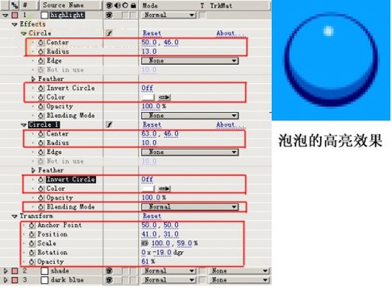 AI干货教程2016-02-15首先我们运用AfterEffects菜单中的Effect->Render->Circle、以及扭曲变形特效Effect->Distort->Transform和Turbulent Displace创建水泡的基本形态,然后通过关键帧的设置模拟水泡形态的动感效果。