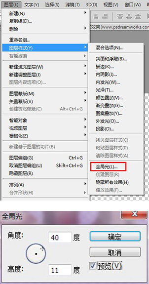 执行图层>图层样式>全局光,调整全局光的角度与高度,你会看到阴影与高光的变化。