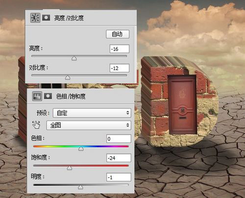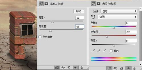 将素材中窗户图片的窗口扣出,放置到文件中,调整到合适大小,并调整色彩/饱和度与亮度/对比度,使其与周围环境更加融合。
