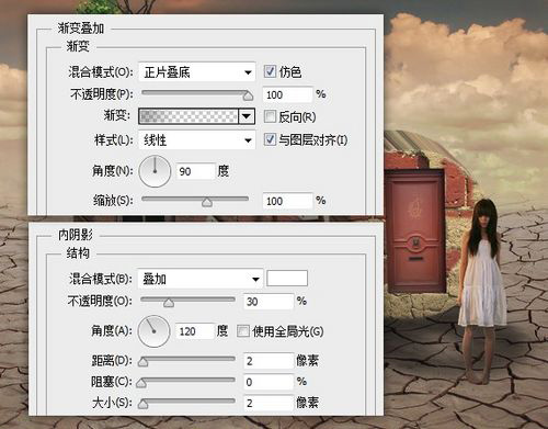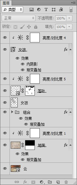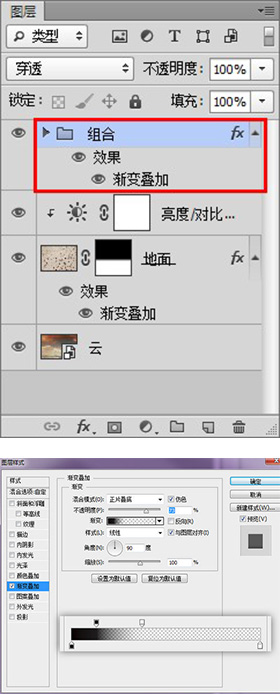 将所有图层(除了地面纹理图层和云图层)创建组,为组添加渐变叠加图层样式(CS6新功能,其他版本的可以将这些图层转换为智能对象后再添加图层样式)。