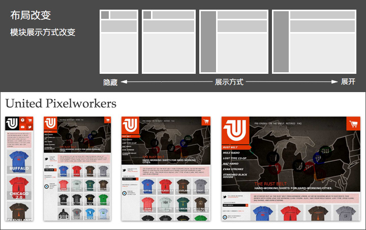 很多时候,单一方式的布局响应无法满足理想效果,需要结合多种组合方式,但原则上尽可能时保持简单轻巧,而且同一断点内(发生布局改变的临界点称之为断点)保持统一逻辑。否则页面实现得太过复杂,也会影响整体体验和页面性能。