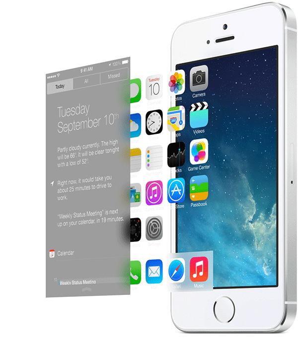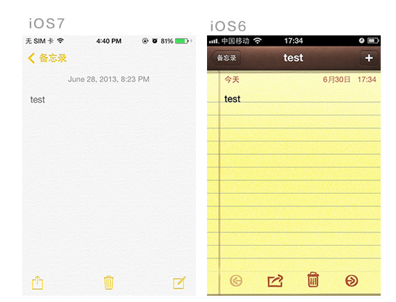 首先,我们看下iOS7上的案例。众所周知,iOS7相对于6设计更加的扁平,去掉了很多质感,保留一些微弱的质感,避免对内容的干扰。这一点遵循了iOS7最新的设计理念,内容优先(Defer to Content),透气(Provide Clarity)。基于内容优先和透气的原则,对之前繁复的UI进行减负,剔除多余元素,有主次的保留,并统一界面里的质感。