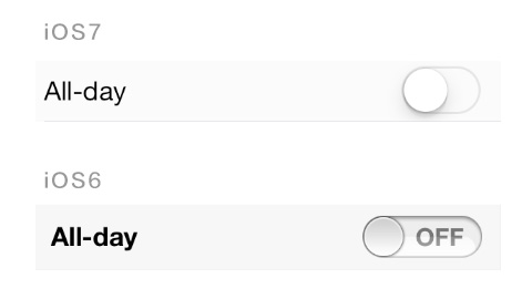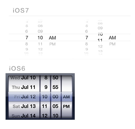 时间设置控件可以很清楚的说明这个问题,新旧两版都是模拟波轮这个物体。只是新版为了更加突出内容,放弃了多余的质感,内容的呈现依然用波轮的方式表现。甚至在你波动波轮时会发现,已选状态上依然保留了玻璃的特性,在边缘会有一个折射效果。由此可以看出,iOS7的简洁还是保留了相当多的拟物细节的。