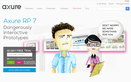 Axure这个是很出名的原型工具了,很多设计师、PM(产品经理)都有用它,它除了能够高效率制作产品原型,快速绘制线框图、流程图、网站架构图、示意图、HTML 模版外,还支持javascript交互的实现,并生成Web格式给用户浏览。