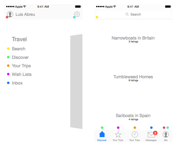将侧边栏菜单移入底部tab栏,你也有机会重新梳理产品的信息架构。下图演示了将侧边栏菜单各条目移入tab栏的方式,你可以根据里面的彩色小点看出信息架构是怎样重新整合的。