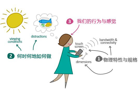 何时何地如何做大家一般都会把移动设备带在身边,所以对其使用也就相对来说比较频繁。比方说在公交地铁上、在路上或者看电视时,我们都可以随时使用。换句话说,我们一般都是在干着其他事的时候“顺便”使用。这样一来,移动设备的使用就会受到视觉条件的限制,或者存在着诸多分散人注意力的因素。