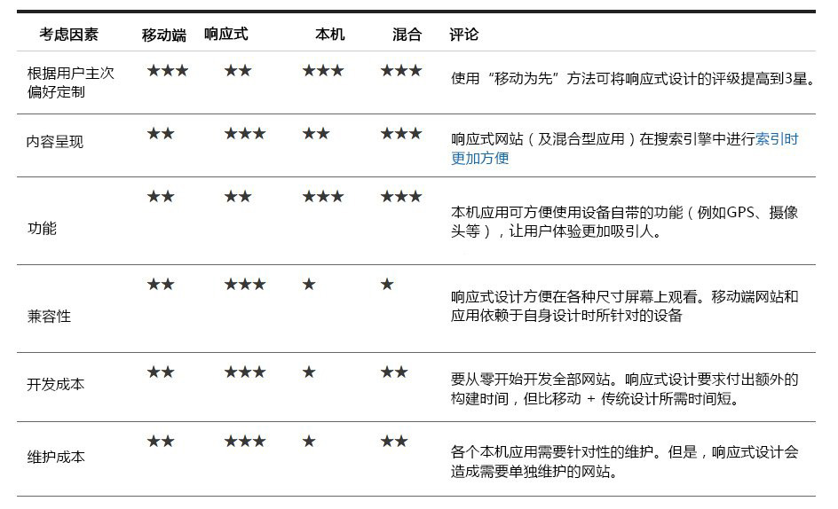 有别于传统网站,移动端的呈现方式比较流行的有四种。使用浏览器查看内容的移动用户最爱的是专门针对移动设备的网站(针对移动设备特别优化)或响应式网站(可针对移动设备调整显示方向或重新布局)。而通过安装应用 浏览内容的用户则一般会选择本机应用或混合型应用。本机应用通常功能完备:应用的所有界面都经过预先的规划。混合型应用则比较灵活一些,其可通过web加载内容(因为需要通过浏览器查看),但最后通过类似应用的界面(或Chrome)进行呈现。
