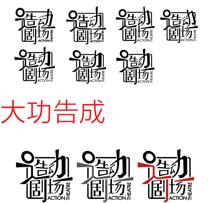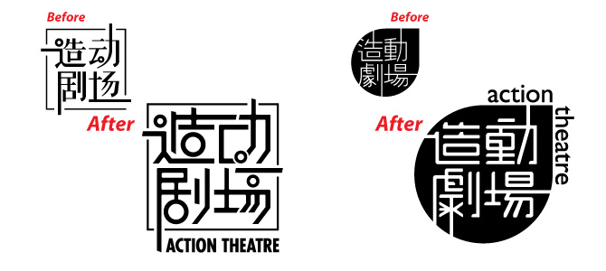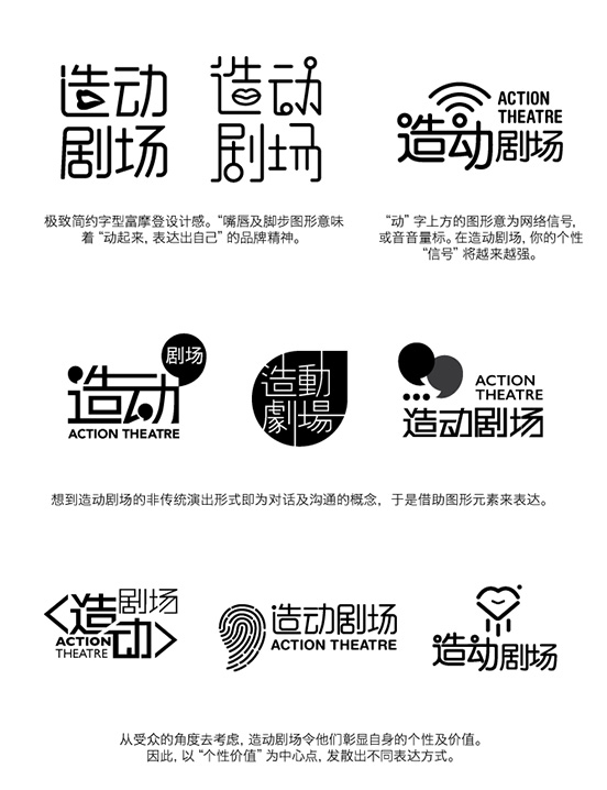 在选定方向后就可以开始作细节调整了,就好比量体裁衣,哪儿不合适了就调整哪儿。在举棋不定的时候,不妨听听设计师们的意见,他们从求学的那天起,就一路在“批判声”中成长起来,所以对哪些绝对不可行的方案,他们的一针见血兴许能拯救你于纠结。造动剧场的Logo初步在两款方案中定夺。左侧原方案字体过于古朴厚重,需有现代感。右侧原方案字体不够精致耐看。为避免现代感笔划所呈现的锋利感,字形中略添圆角,保持柔和友好。
