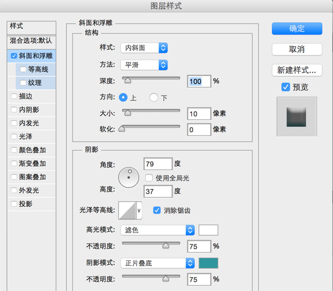 设置斜面和浮雕: 大小:10 取消使用全局光 角度:79 高度:37 勾选消除锯齿 阴影颜色:#2F959D