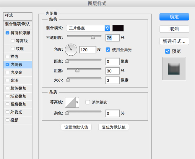 设置内阴影: 距离:0 阻塞:30 大小:3