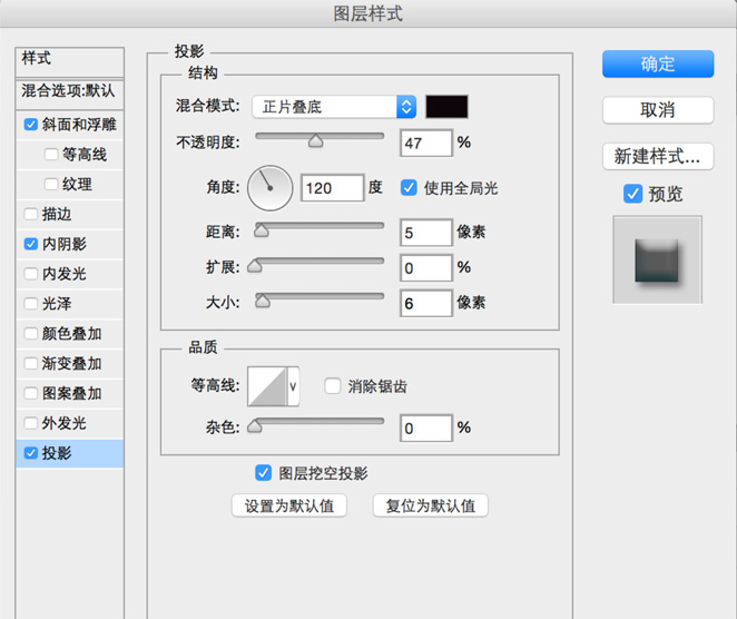 设置投影: 不透明度:47 距离:5 大小:6