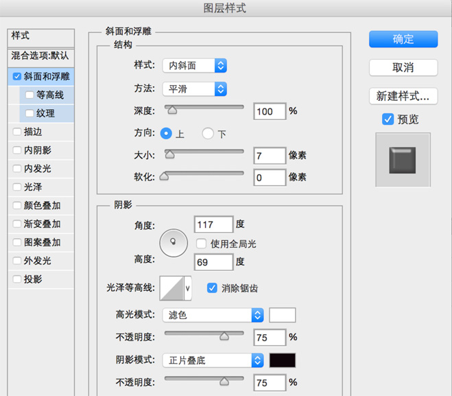 设置斜面和浮雕: 大小:7 取消使用全局光 角度:117 高度:69 勾选消除锯齿