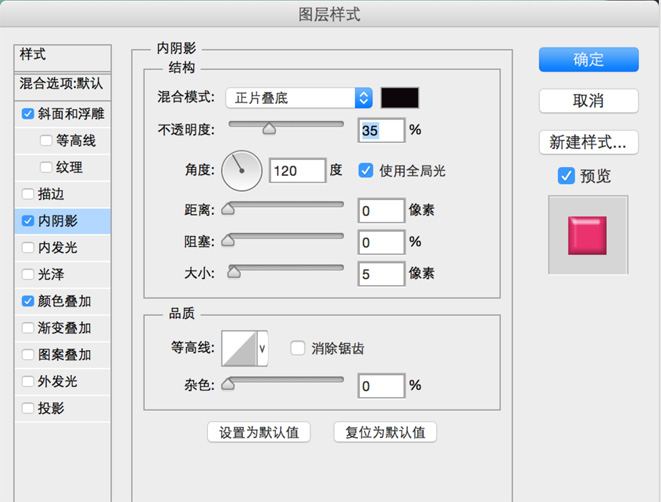 设置内阴影: 不透明度:35 距离:0 大小:5