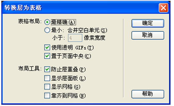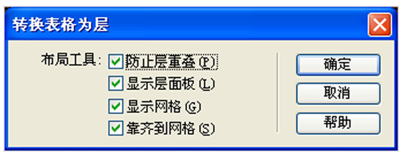 在转换为表格之前,请确保层没有重叠。请执行以下操作:选择“修改”>“转换”>“层到表格”。即可显示“转换层为表格”对话框。