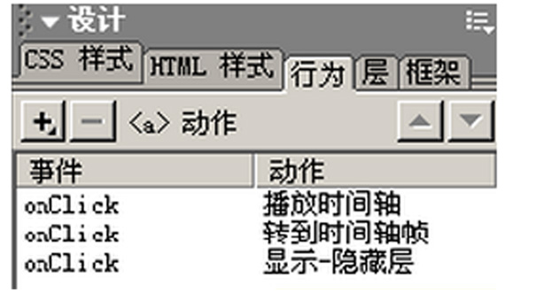 8.重复步骤5,选择 [显示隐藏层] ,和刚才步骤6相反,这次我们选择显示,确定后,保证行为面板中显示隐藏图层的时间都是onclick。此刻展开按钮的行为面板如图: