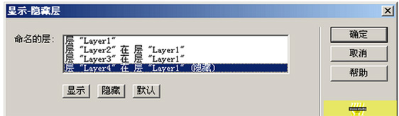 6.怎么样,看到了吧:)我们再给图层添加上一个简单的关闭动作,就是点击关闭按钮后图层隐藏。选择上关闭按钮,转到行为面板,点击菜单中选择 [显示隐藏层] ,在跳出的窗体中选择上layer4,然后点击下面的隐藏按钮,将其设置为隐藏,如图: