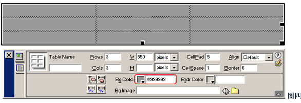 2、在属性面板中定义表格的Border为0,CellPad为5(这项可使单元格中的内容与单元格边缘之间保持5个像素);CellSpace为1(此项使得单元格之间保持1个项素的间距)。如图三;