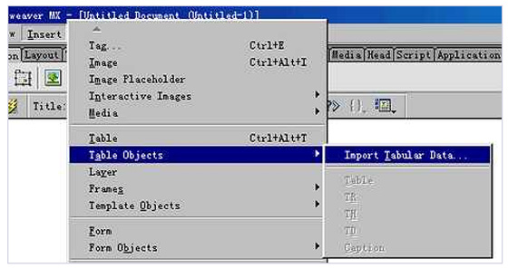 2、(1)打开DW MX,新建一个html页面,选择菜单栏insert/table objects/import tabular data这项。