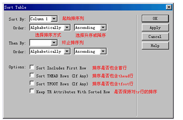 (2)出现sort table窗口,sort by项选择column 1,order项选择按字母排序Alphabetically和升序排列Ascending,其它各项各位可参照图5根据需要进行选择。
