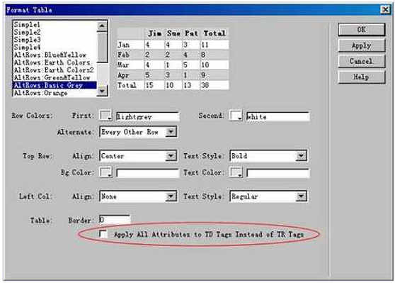 (2)出现format table窗口,左上角有各样式,可根据你的喜好来选择,因为其余各项都是傻瓜式的操作,在这里就不一一介绍了,只是对最后一项强调一下,该项是询问你是否把各样式代码添加到TD标记里而非默认添加到TR标记中,在这里笔者建议你不要勾选,否则会生成比默认设置多得多的代码。